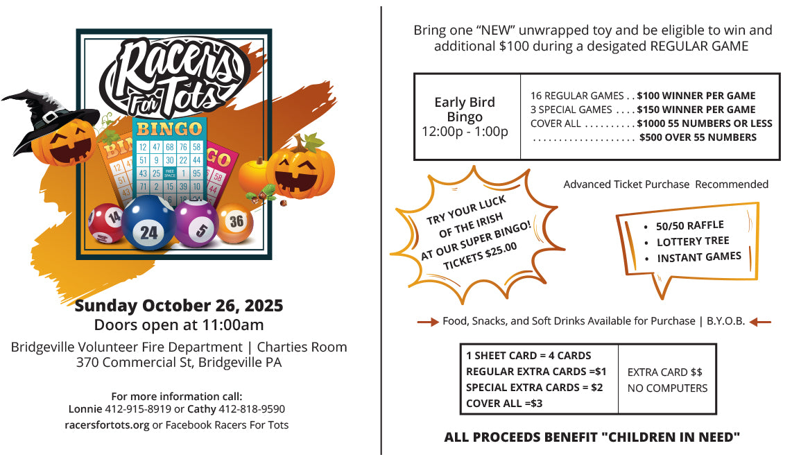 This year the organization will celebrate 24 years there are many raffles and fundraisers planned including: 2 Super Bingos (April/October), a 4th of July Picnic Raffle, the annual Golf outing, and the 22nd Annual Rocket Chassis Giveaway. Please Check back as dates are being finalized!